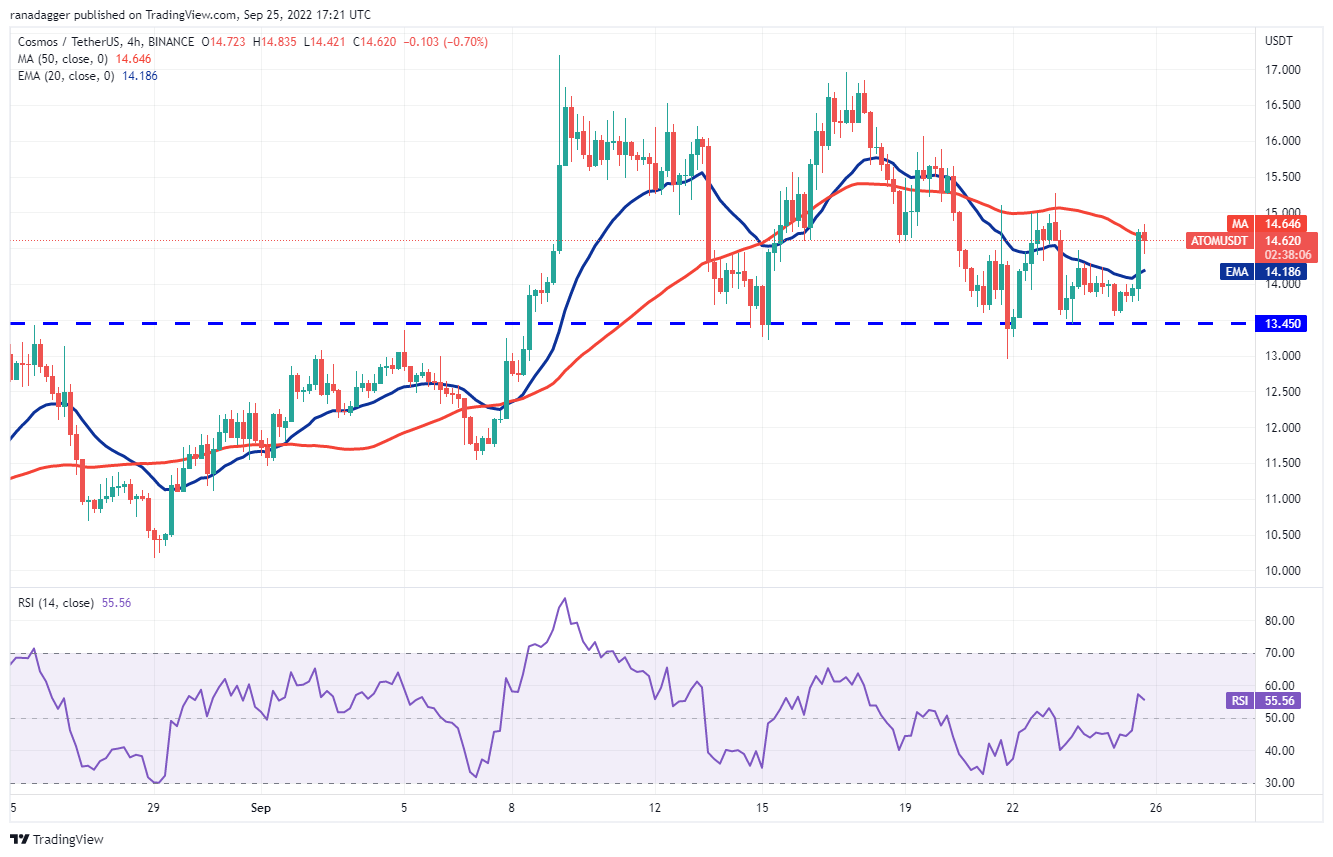 La EMA de 20 días ($14,22) se ha nivelado y el RSI está cerca del punto medio, lo que indica un equilibrio entre la oferta y la demanda. Si el precio supera los $15,26, la ventaja a corto plazo podría inclinarse a favor de los compradores. El par ATOM/USDT podría subir a $17,20.