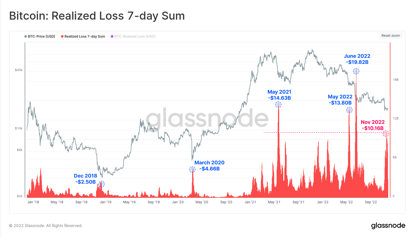 En noviembre se registraron USD 10,800 millones en pérdidas realizadas en 7 días para Bitcoin. La mayor pérdida realizada registrada en la historia de Bitcoin es la de junio de 2022, cuando se registraron USD 19,800 millones. Estas pérdidas muestran que un gran volumen de Bitcoin ha cambiado de manos a precios descontados.