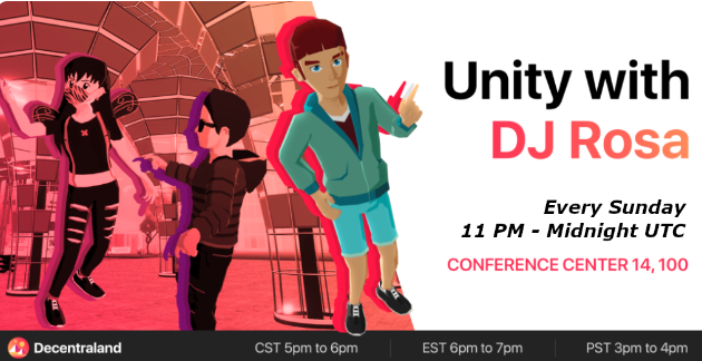 DJ Rosa en el Unity Café en el Decentraland Conference Center. Socialice, establezca contactos, aprenda más sobre Decentraland y escuche buena música.