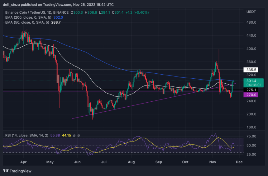 - El precio de BNB rebota desde un mínimo de $ 250 en el marco de tiempo diario a medida que el precio recupera $ 300 a medida que el precio se negocia por encima de la media móvil exponencial (EMA) de 50