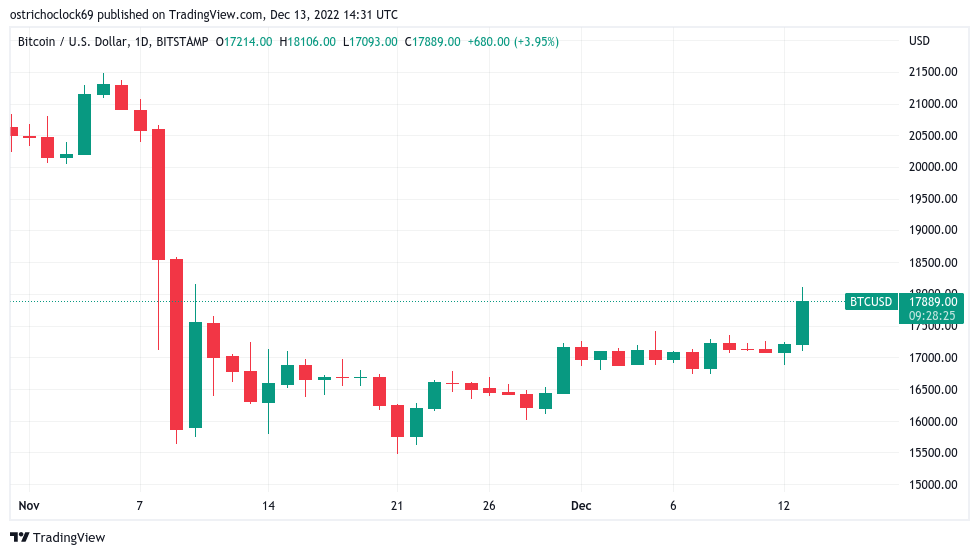 Los datos de Cointelegraph Markets Pro y TradingView mostraron que el par BTC/USD alcanzó los USD 18,105 en Bitstamp después de que el Índice de Precios al Consumo (IPC) de noviembre se situara por debajo de las expectativas.