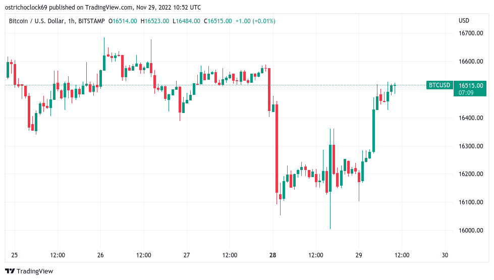 Bitcoin (BTC) mantuvo un soporte crucial de USD 16,000 el 29 de noviembre, puesto que los alcistas se sacudieron la caída de FTX y los desencadenantes macro-económicos.