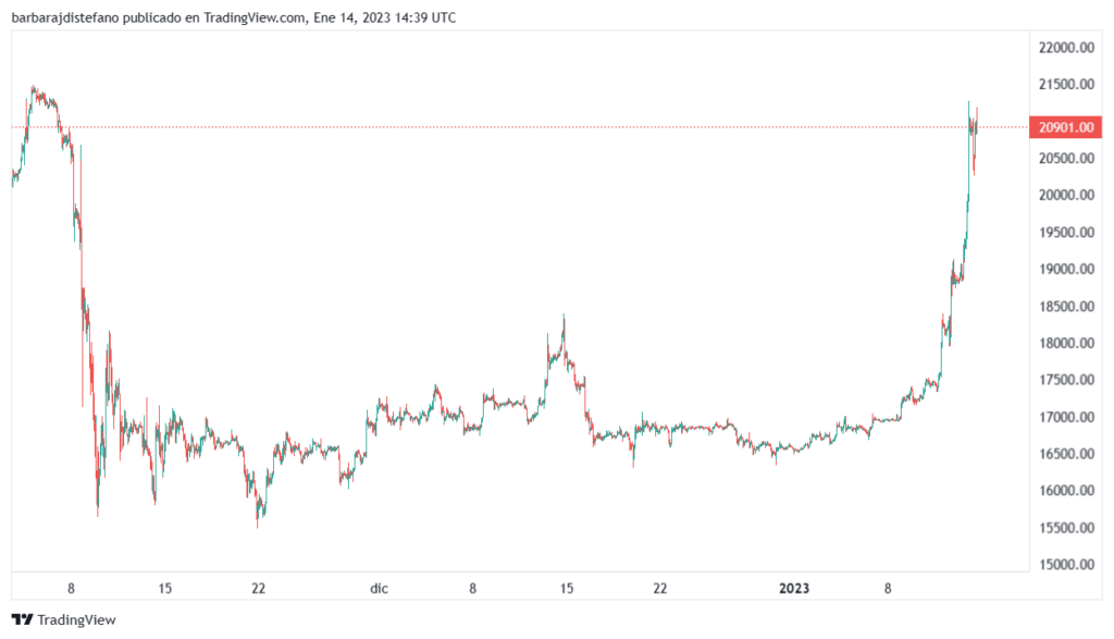 Bitcoin (BTC) llegó la madrugada del 14 de enero a USD 21.200 y luego retrocedió ligeramente al margen de los USD 20.000. La criptomoneda no cotizaba en estos niveles desde antes del colapso de FTX que arrastró su precio a su mínimo anual. Por eso, la actual subida encendió el sentimiento alcista de algunos traders.