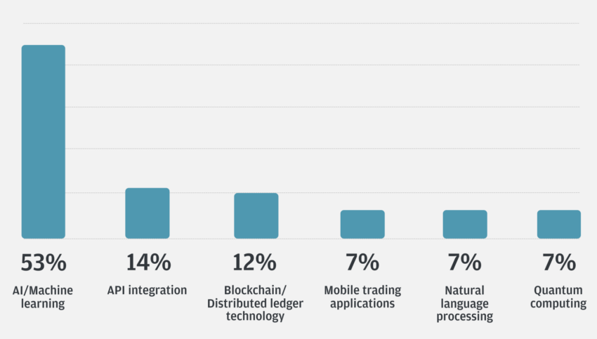 JPMorgan descubrió que 53 por cien de los inversores institucionales encuestados piensan que la inteligencia artificial (IA) y el aprendizaje automático serán las tecnologías más influyentes que van a dar forma al futuro del comercio a lo largo de los próximos 3 años, un aumento significativo respecto del 2. por cien del año anterior.