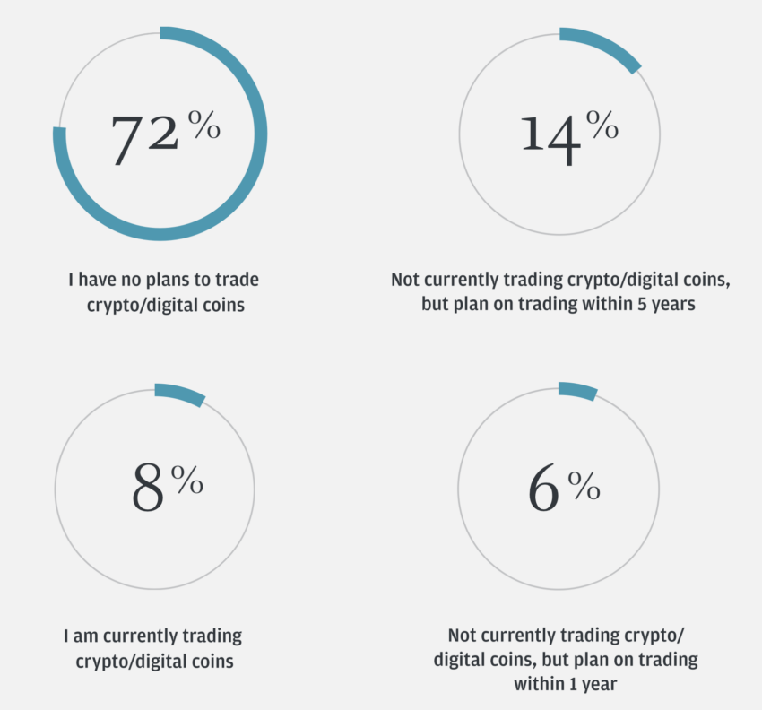 El informe de edición de comercio online también analizó el futuro de las criptomonedas. Alrededor del 72 por ciento de los inversores institucionales dicen que no tienen planes de invertir en criptomonedas o monedas digitales. Pese a esto, el informe apuntó que los participantes anticipan que el 64 por ciento de sus actividades estarán en esta industria para 2024.