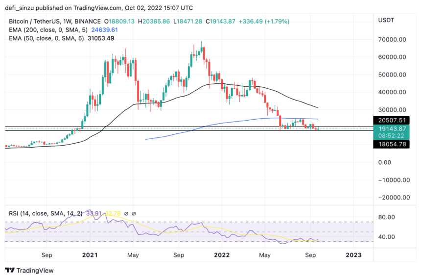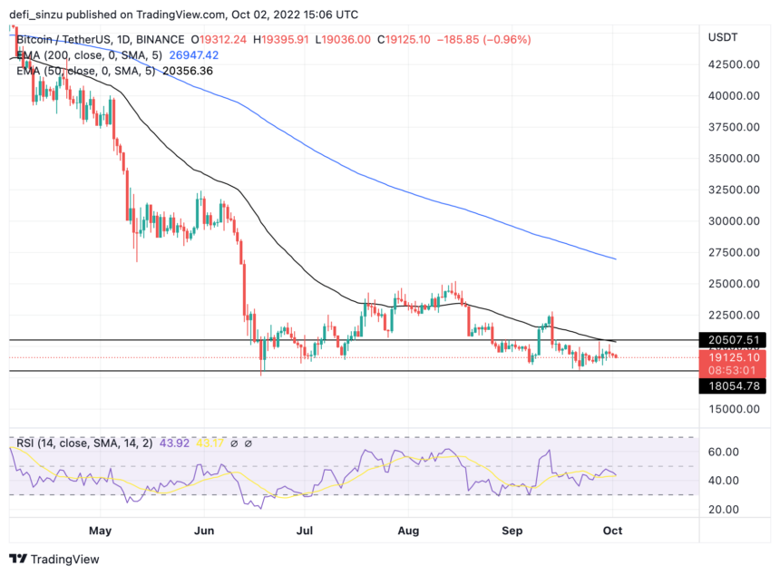 El precio de BTC cotiza a $ 19,100 por debajo de la media móvil exponencial (EMA) de 50 y 200. Los precios de $20 400 y $27 000 corresponden a los precios a 50 y 200 EMA para BTC en el marco de tiempo diario.