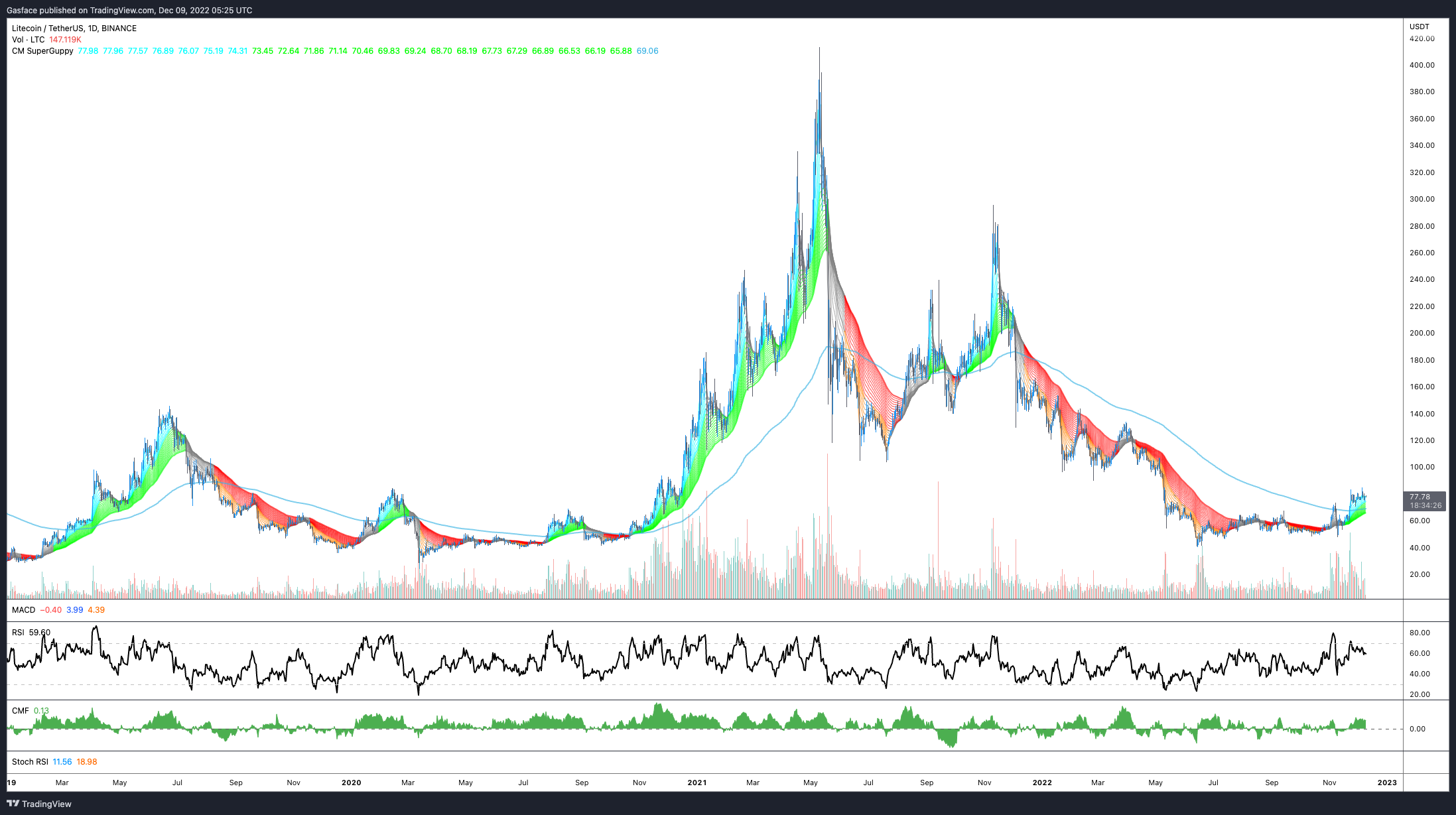 El Guppy Multiple Moving Averages (GMMA) en el marco temporal diario también se ha