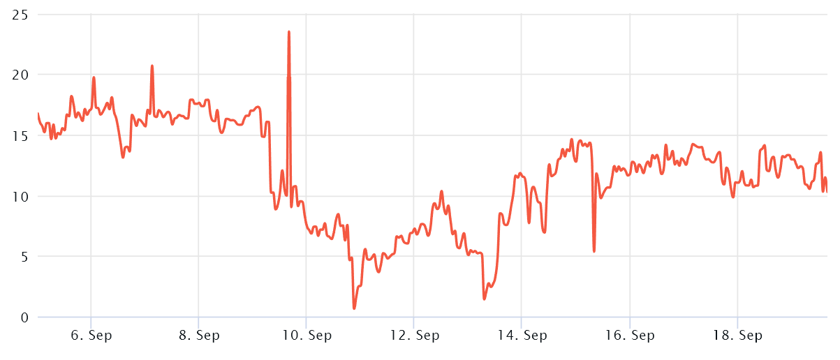 El sesgo delta de 30 días había estado cerca del umbral del 12% desde el 15 de septiembre, y señaló que los comerciantes de opciones estaban menos inclinados a ofrecer protección a la baja. El movimiento negativo del precio del 19 de septiembre no fue suficiente para cambiar a esas ballenas bajistas, y el indicador actualmente se ubica en 11%.