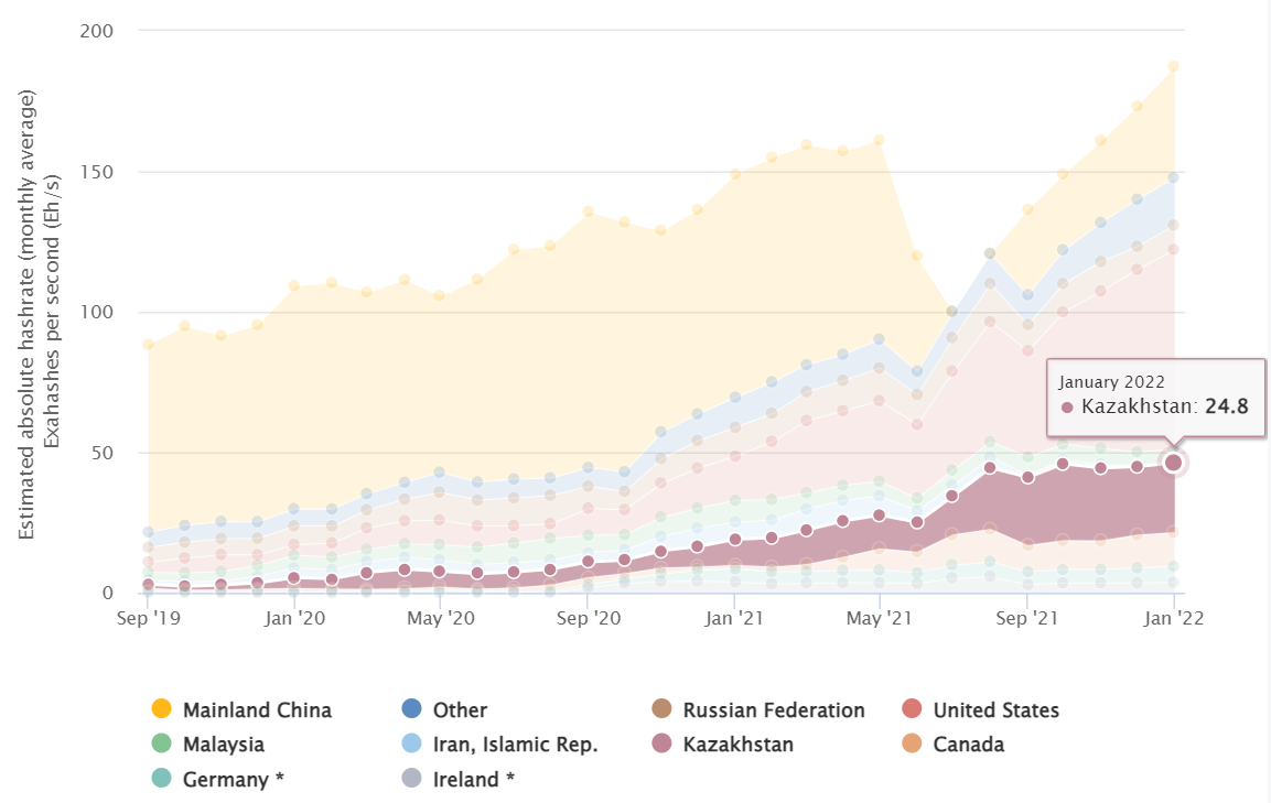 A partir de enero de 2022, Kazajstán contribuyó con el 13,22 % de la tasa de hash total de Bitcoin, posicionado justo después de los líderes históricos de Estados Unidos (37,84 %) y China (21,11 %), como se muestra a continuación.