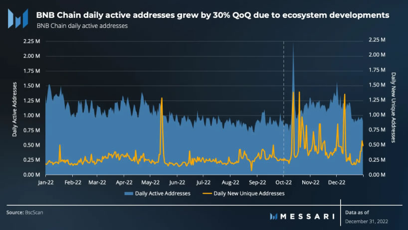 “En última instancia, fue una señal positiva que los catalizadores para el crecimiento de usuarios vinieran de la mano de una base de usuarios fundacional y una valoración más conveniente para la red de BNB Chain, en especial después de que el drama de FTX se desarrollase a lo largo del cuarto trimestre.”