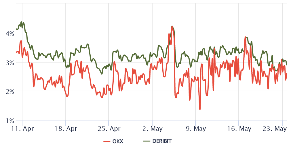 De acuerdo con los datos anteriores, el indicador básico de Bitcoin ha estado por debajo del 4 % desde el 12 de abril. Esta lectura es típica de los mercados bajistas, pero el hecho de que no se haya deteriorado después de la venta masiva a $25 400 el 12 de mayo es alentador.