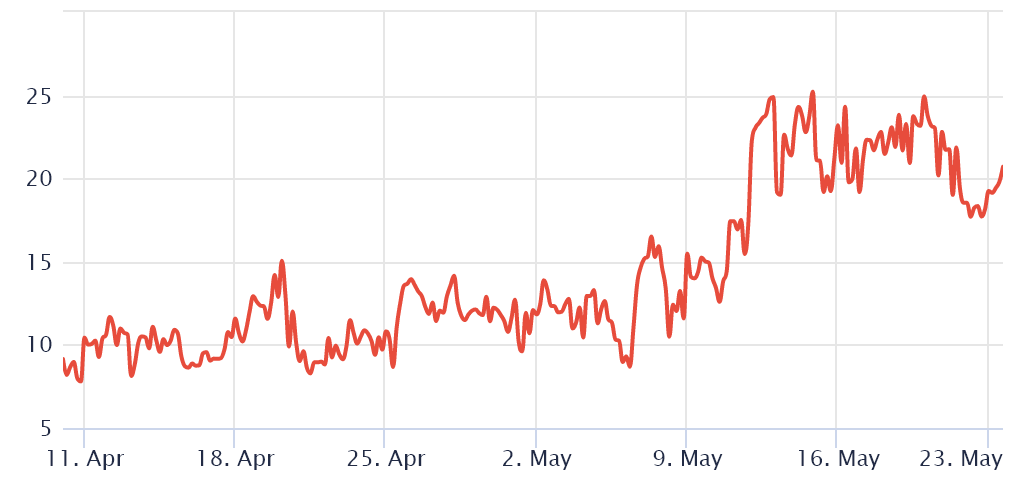 Aún así, los mineros no muestran signos de capitulación incluso cuando los movimientos de sus billeteras a los intercambios alcanzaron un mínimo de 30 días el 23 de mayo, según la plataforma de análisis en cadena Glassnode.