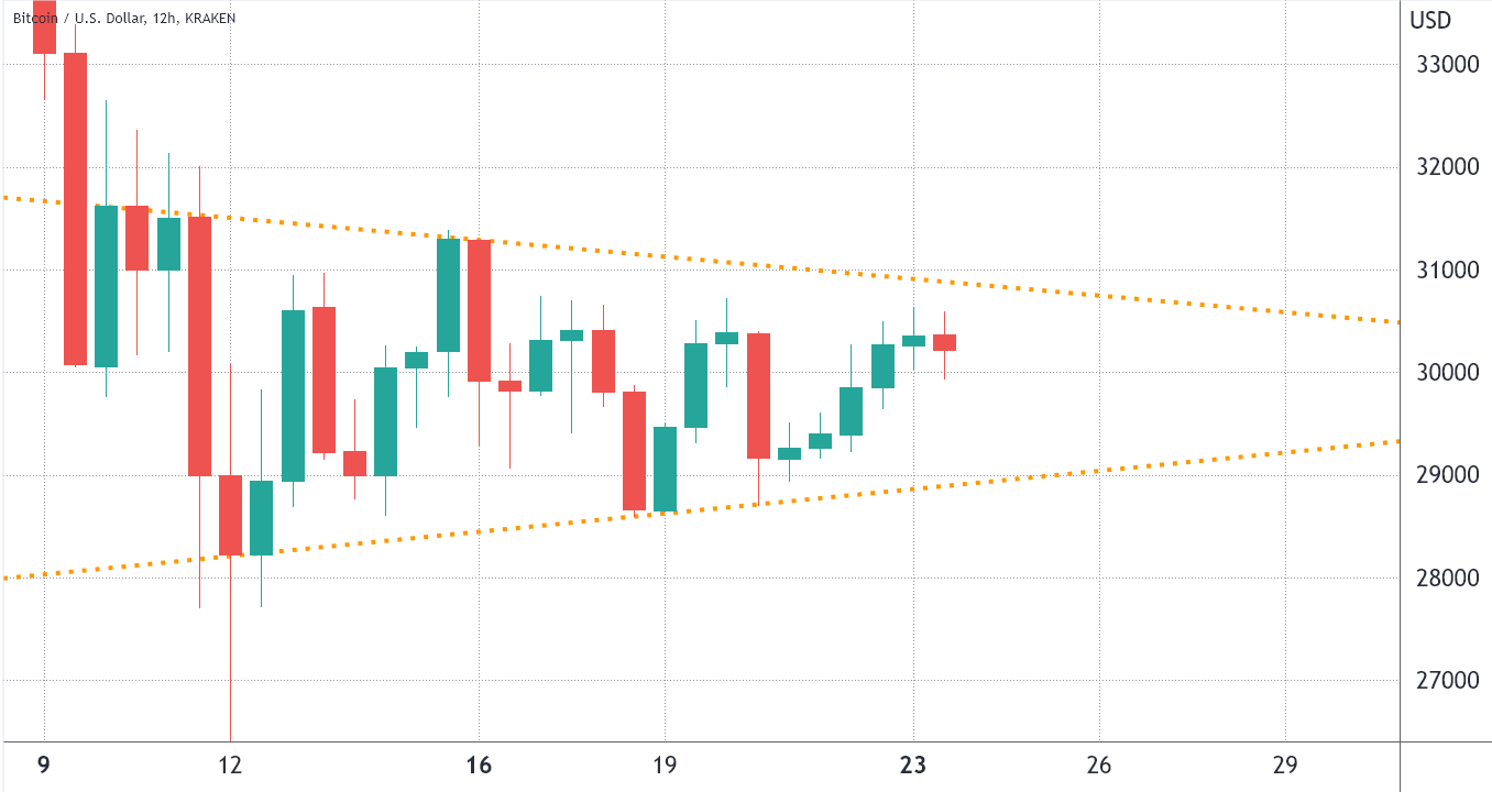El gráfico de Bitcoin ( BTC ) ha formado un triángulo simétrico, que actualmente tiene un rango estrecho de $28,900 a $30,900. Este patrón se ha mantenido durante casi dos semanas y podría extenderse potencialmente por otras dos semanas antes de que el precio realice un movimiento más decisivo.