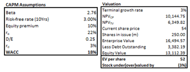 "Nuestro precio objetivo de [COIN] es de alrededor de $52 [en 2022]", señaló Rumak Research, un grupo de analistas financieros, en su reciente evaluación de Coinbase. El análisis dado se basó en reacciones a ciclos de mercado anteriores, junto con su modelo de valoración de activos de capital (CAPM), como se muestra a continuación.