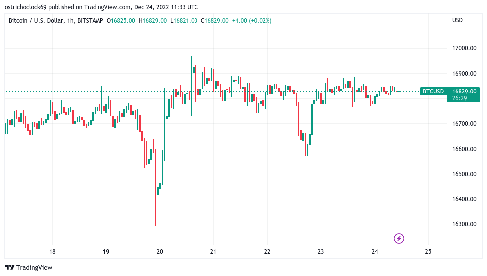 El precio de bitcoin (BTC) entró en el período de vacaciones de Navidad sin cambios en el nivel de los USD 16,800 mientras una extraña falta de volatilidad perseveraba.