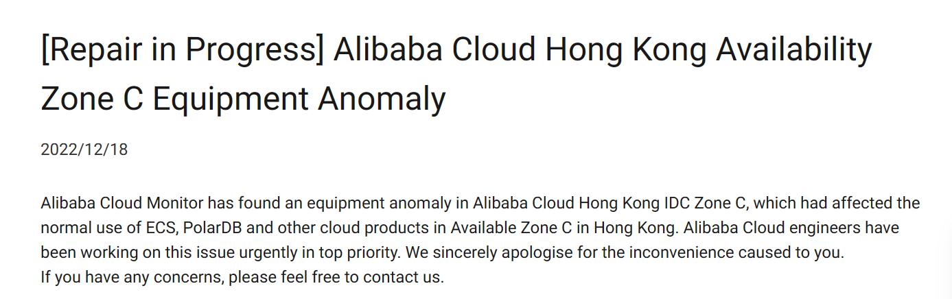 El sitio web de Alibaba Cloud muestra que el servidor de Hong Kong (China) alberga tres zonas de disponibilidad, operativas desde 2014. El proveedor de la nube confirmó la caída a través de un anuncio oficial, como se muestra a continuación.