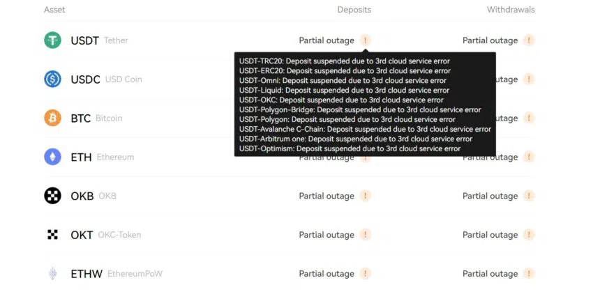 Al momento de la publicación, la página de estado de OKX mostró que el exchange no estaba procesando depósitos o retiros en su plataforma. Según el exchange, estos servicios se suspendieron debido a un “error del servicio en la nube”.