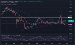 El precio de BNB rebota desde $ 250 a medida que el precio sube a un máximo de $ 300 cuando los...