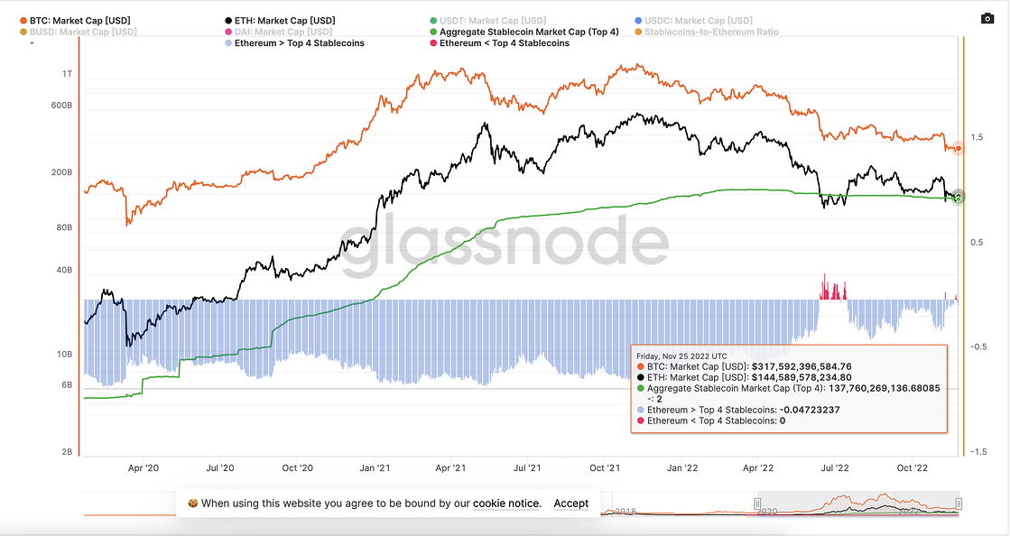 Según los datos compendiados por Glassnode, el mercado de las monedas ‘estables’ superó brevemente a la capitalización de mercado de la primera altcoin del mercado, Ethereum a lo largo de unos días en el 2022.