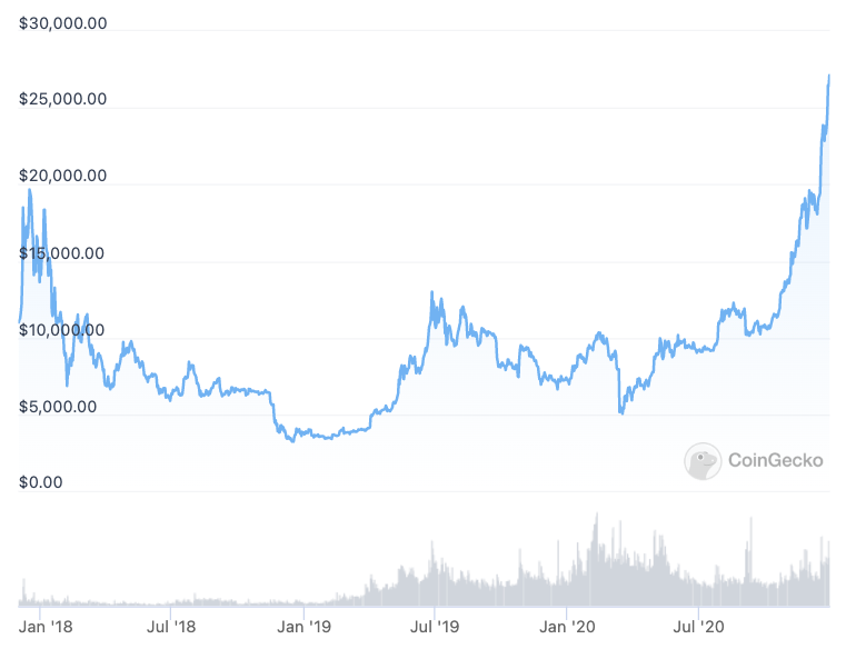 Sin embargo, al igual que el pico histórico anterior de Bitcoin de $ 1,000, el triunfo de $ 20,000 duró poco, ya que Bitcoin cayó y perdió más del 60% de su valor en un par de meses.