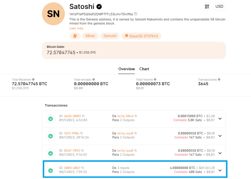 De esta forma, la dirección (la cual contiene los 50 BTC minados en el bloque génesis), acumula 72 BTC al momento de la publicación.